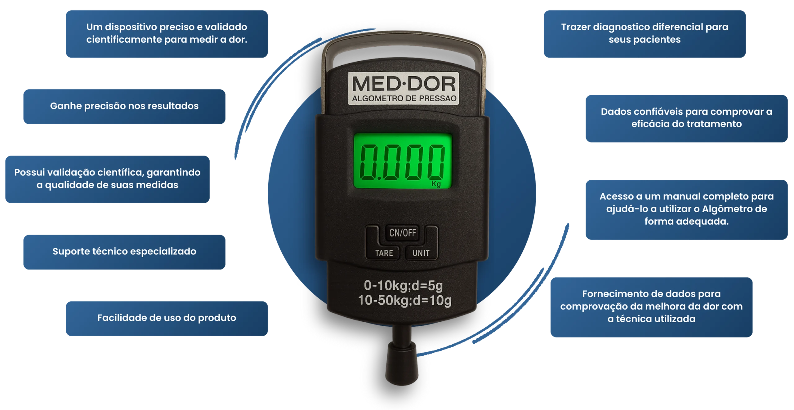 Com o Algômetro de pressão MED.DOR você terá a ferramenta mais precisa para medir a dor e fornecer dados de melhoria para seus pacientes. Ele é o aliado ideal para fisioterapeutas, odontólogos, neuromoduladores, pesquisadores e demais profissionais que tratam de dores que desejam ter resultados precisos em seus tratamentos.
